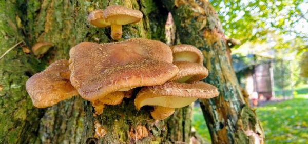 De eikenstammen geven weer een vlucht shiitakes De stammetjes hebben zich dit najaar (2025) weer volgezogen met water en de shiitakes komen nu, voor het tweede jaar, massaal door de boorgaatjes naar buiten. Het is een rijke oogst. Deze paddestoel heeft mooi stevig vlees en smaakt uitstekend. |